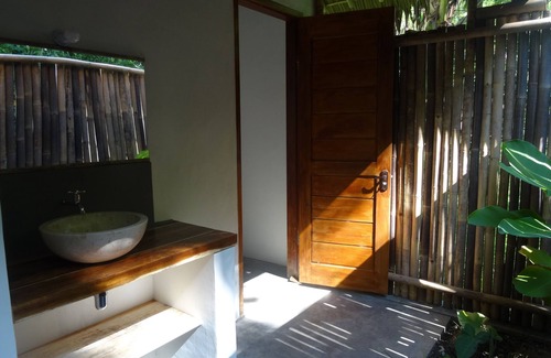 Large tropical bungalow in traditional self ventilated construction, beautiful private terrace with hammock. It has a large king size bed with its large mosquito net. The open air shower room allows you to take a shower while observing the jungle. You can enjoy the beautiful pool after your surfing session. This is ideal for a couple surftrip on the island of Java.