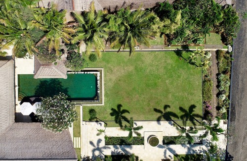 Our villa is in a large tropical garden with swaying palm trees, exotic plants, Buddha statues and lotus ponds, with 18 m. infinity pool and jacuzzi.