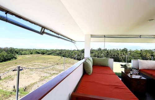A peaceful area close to Canggu. Sitting on a 1500 square meter land, the property consists of four individual apartments, a modern fully equipped kitchen, a large swimming pool and outdoor lounging area and a garden styled rooftop deck that overlooks breathtaking views of 360 degrees rice fields, Pura Gede Luhur and the majestic Mount Agung.
